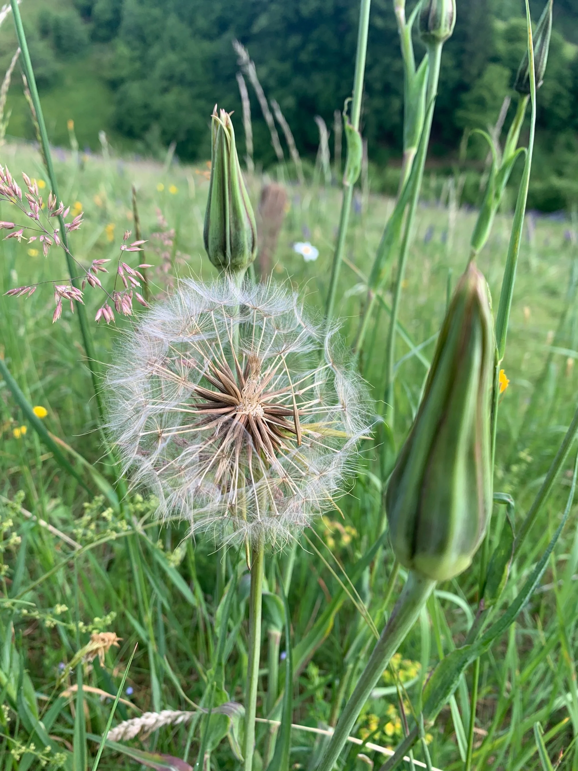 Im Jahreslauf bildet sich dann aus dem Blütenkopf eine große Pusteblume, die ich auch auf der Wiese bereits entdecken kann.